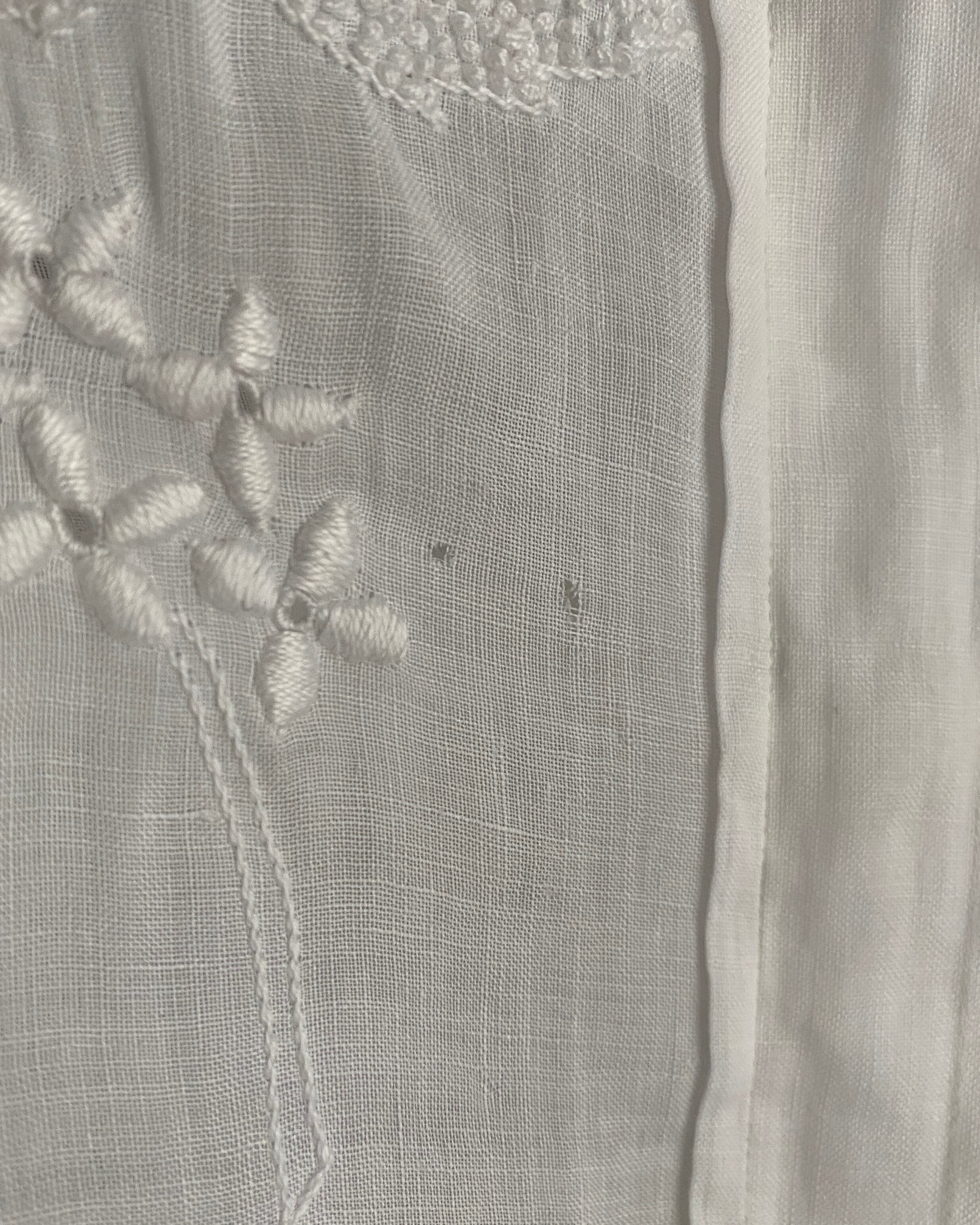 繊細なお花の刺繍がフロントやお袖口に施されたantiqueのブラウス。パリッとしたハリのある、オーガンジーのようなコットン生地です。トレンドの短丈で、ほどよいシアー感がレイヤードの楽しいアイテム。バックスタイルも、この時代ならではのグッドディテールです。フロントのボタンで開閉。優しくお洗濯済みです。