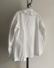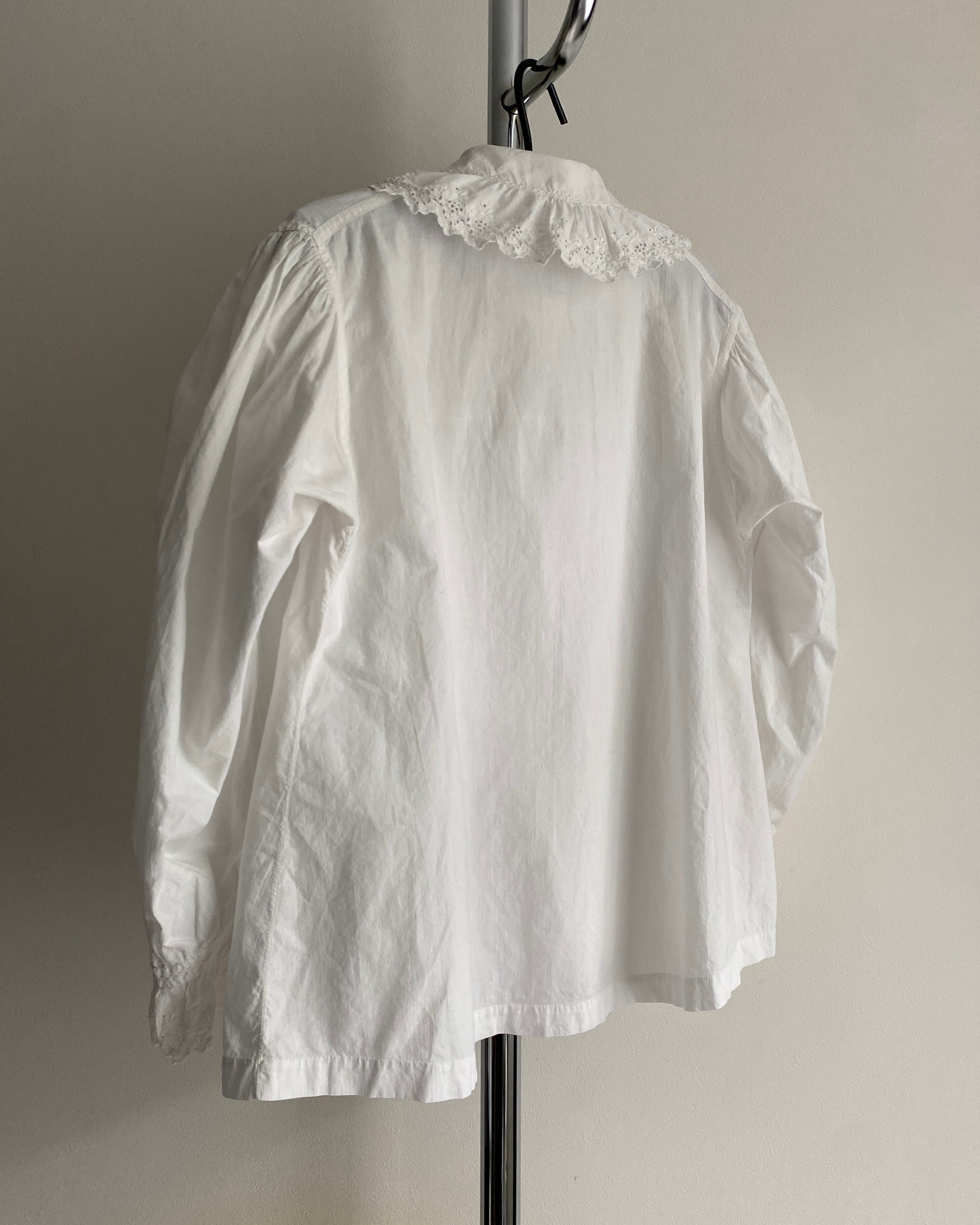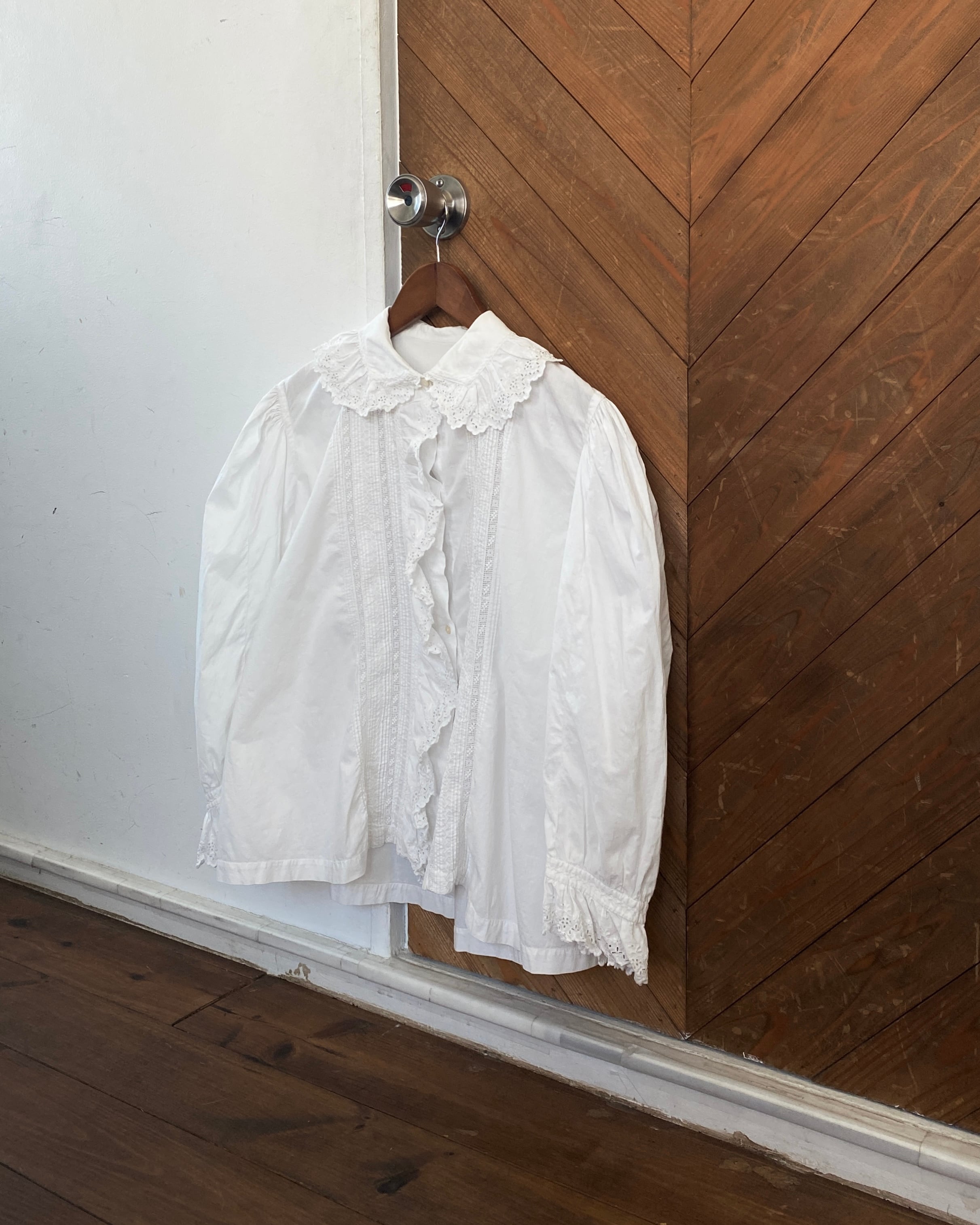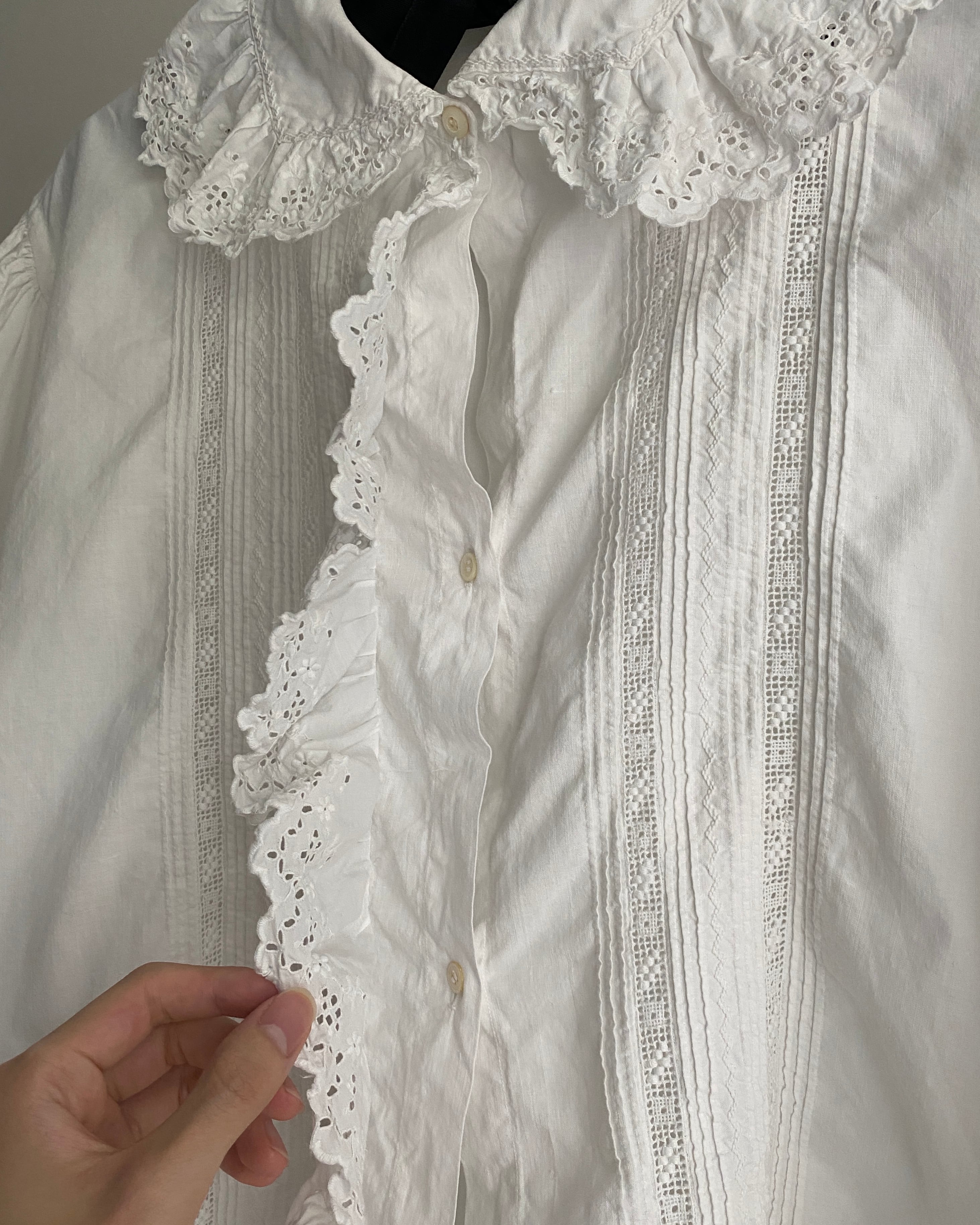 French antiqueの王道のスタイルのラウンドカラーブラウス。襟のカットワークやフロントのタック、レースインサート、肩のギャザーやふわっとしたAラインのシルエットなど、クオリティの高いディテールに加え、グッドコンディションです。一枚ではもちろん、さまざまなアイテムとレイヤードしたり、フロントオープンでガウンとしてご着用いただいても素敵です。優しくお洗濯済みです。