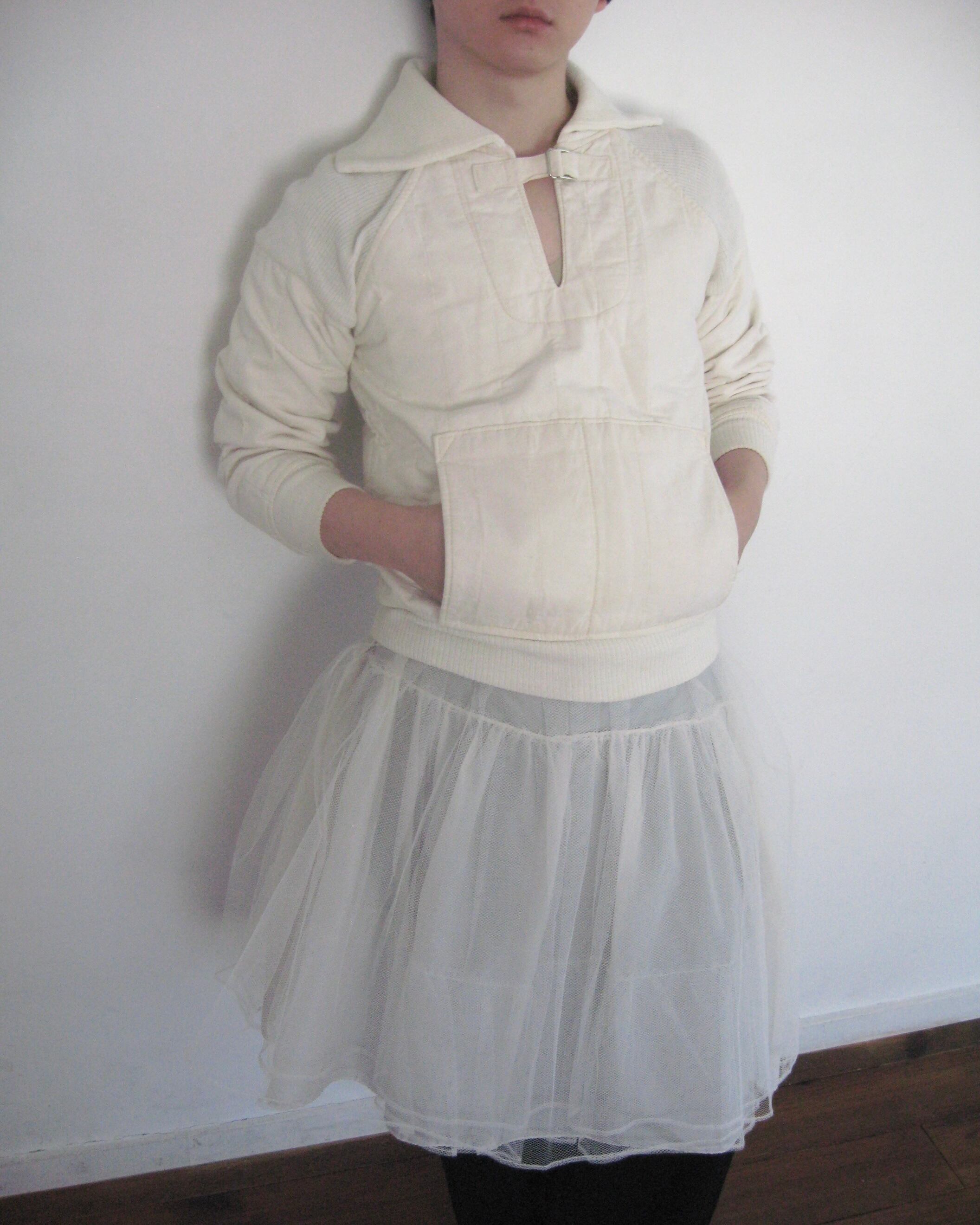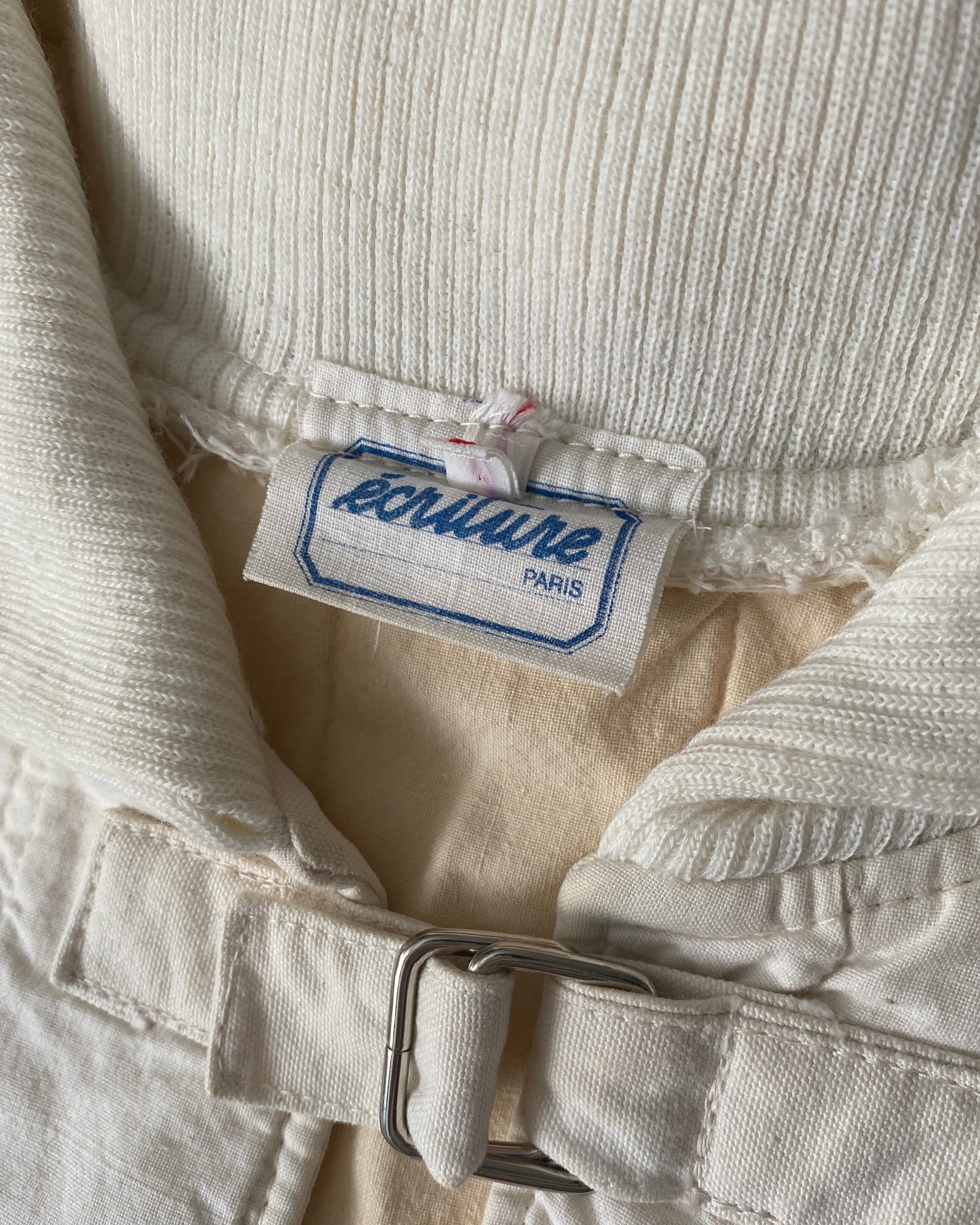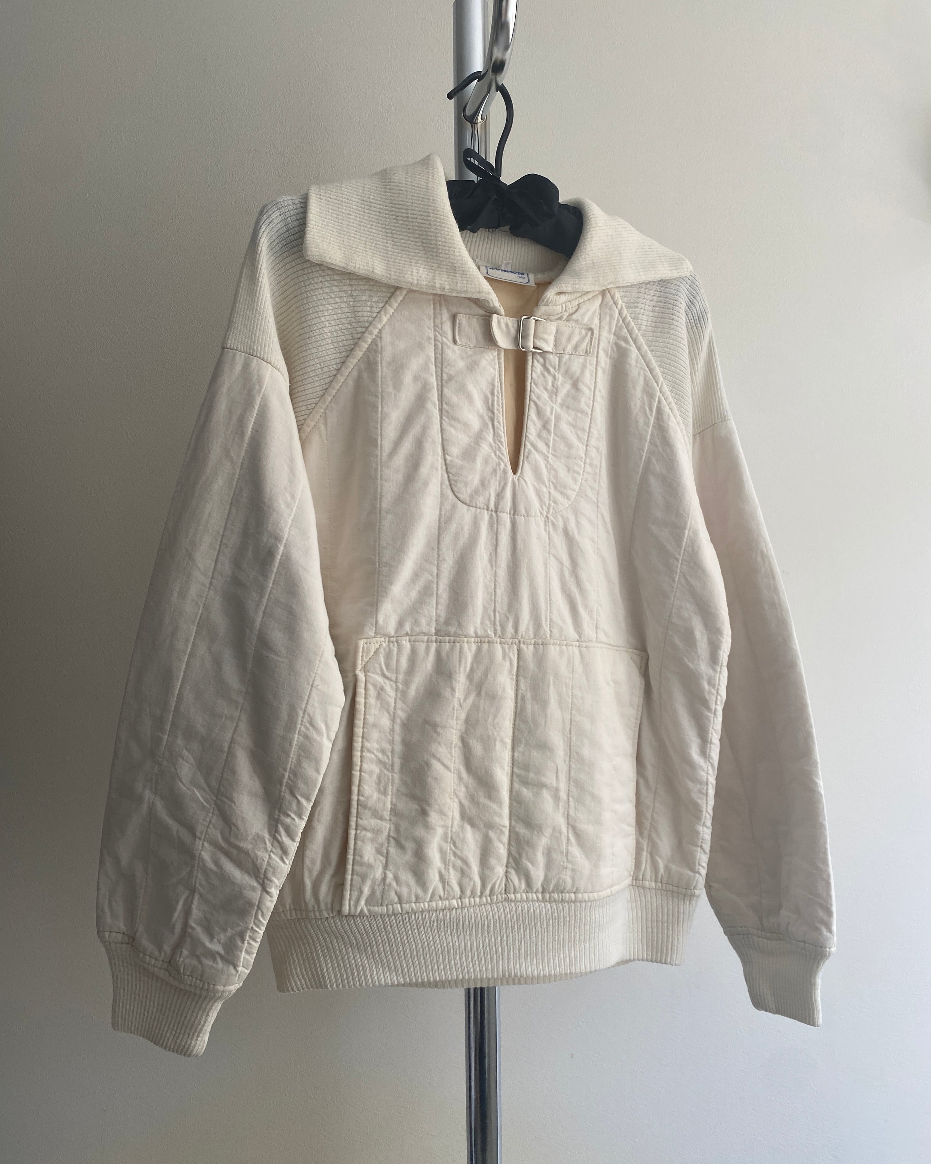Made in FranceのVintageプルオーバートップスです。暖かいパッド生地とリブニット生地のコンビネーション。柔らかなアイボリーの色調に、大きな襟のアクセントが可愛いです。さまざまなボトムスとの組み合わせはもちろん、ドレスの上から着るのもオススメです。胸元のベルトで開き具合を調節できます。フロントポケット付き。優しくお洗濯済みです。