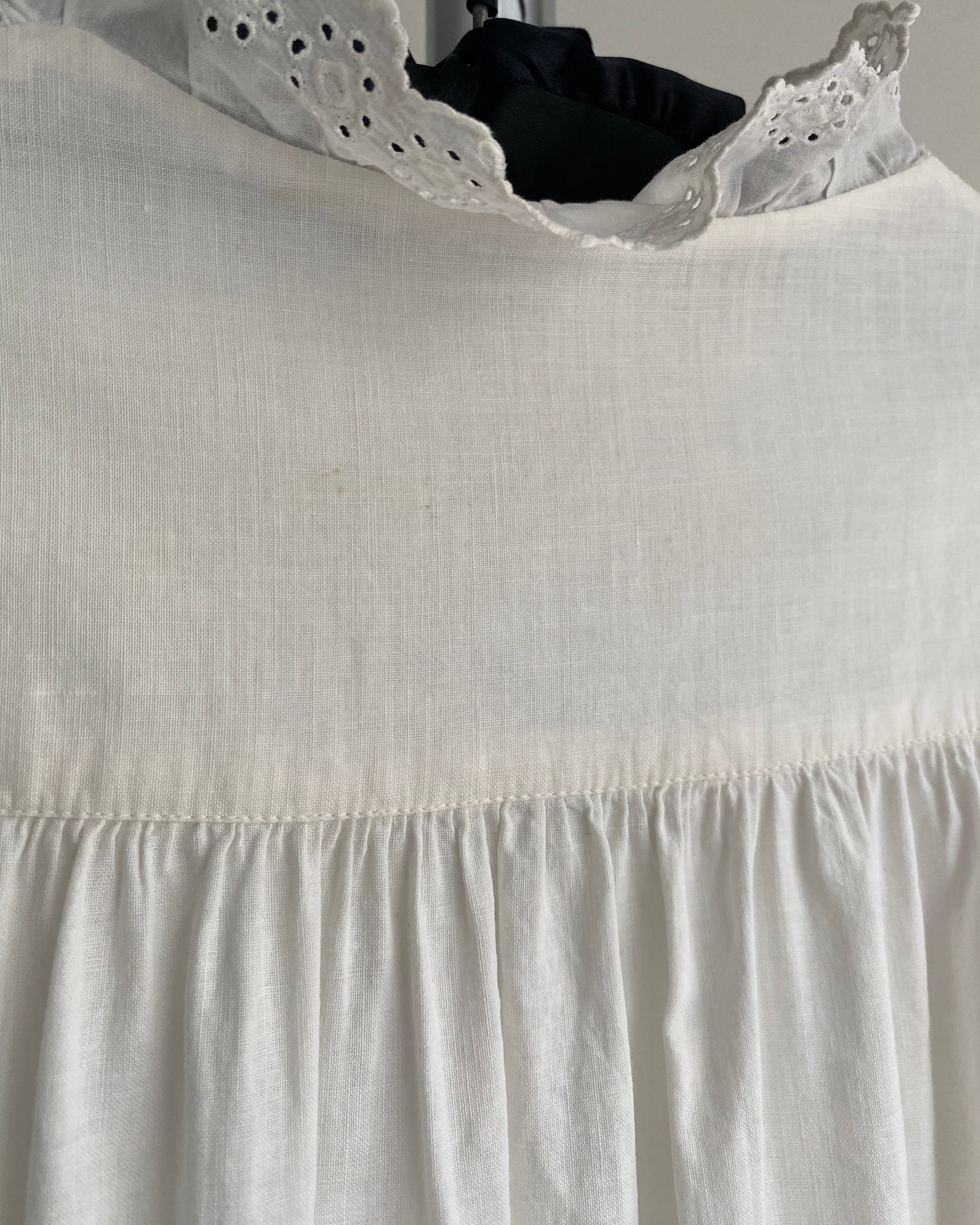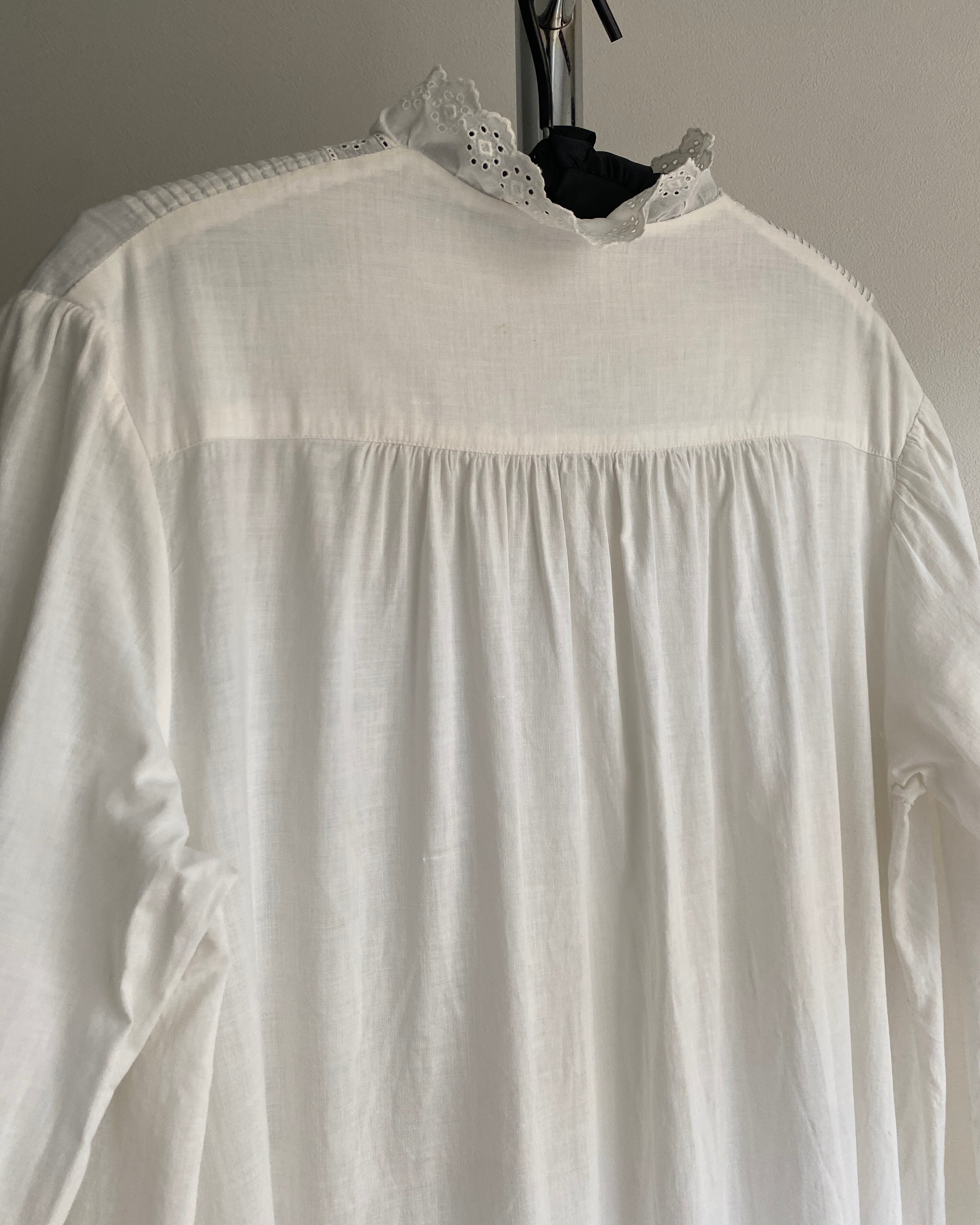 細やかなタックやアイレットレースのディテール、胸元と背面にたっぷり寄せられたギャザーが美しいantiqueナイトドレス。胸元と袖口のベルベットリボンの装飾は、後年にリメイクで付けられたものです。贅沢に使用されたコットン生地が、美しいAラインのシルエットを演出します。Vネックのお作りで、甘すぎないバランス感も魅力的です。お好きなベルトやリボンでウエストマークして、シルエットをシェイプさせたスタイリングもオススメです。フロントのボタン2点で開閉。優しくお洗濯済みです。