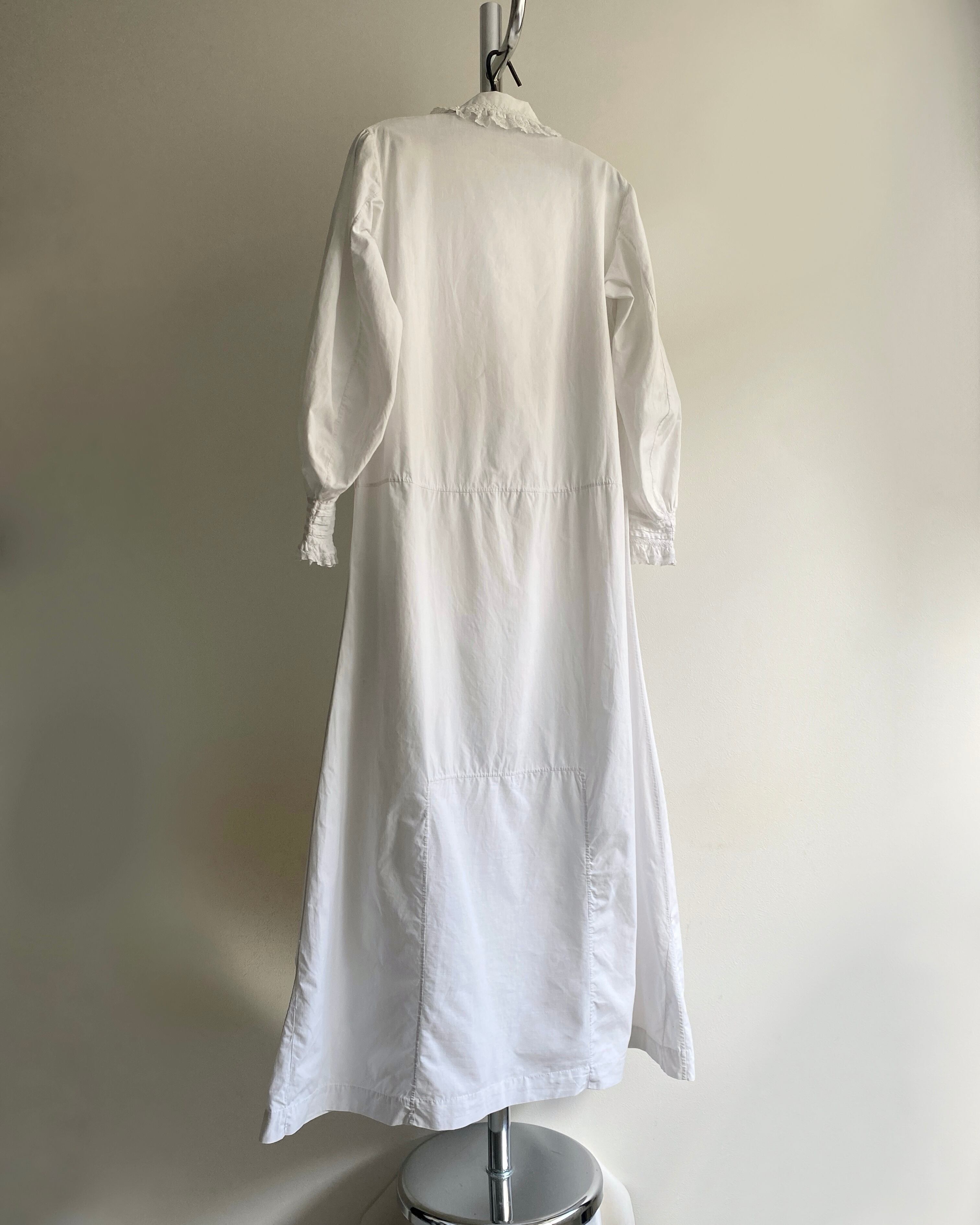 ブラウスとスカートがドッキングしたようなデザインのantiqueナイトドレス。タックやコード刺繍、繊細なレーストリムがロマンティックです。贅沢に使用されたコットン生地の美しいAラインのシルエットや、ほどよいバルーンスリーブが素敵です。フロントのボタンをフルクローズで着ても、開けてレイヤードしたアイテムを見せて着ても可愛いです。寒い時期にはニットやスウェット、テーラードジャケットと合わせるのがオススメです。さまざまなスタイリングでお楽しみください。優しくお洗濯済みです。