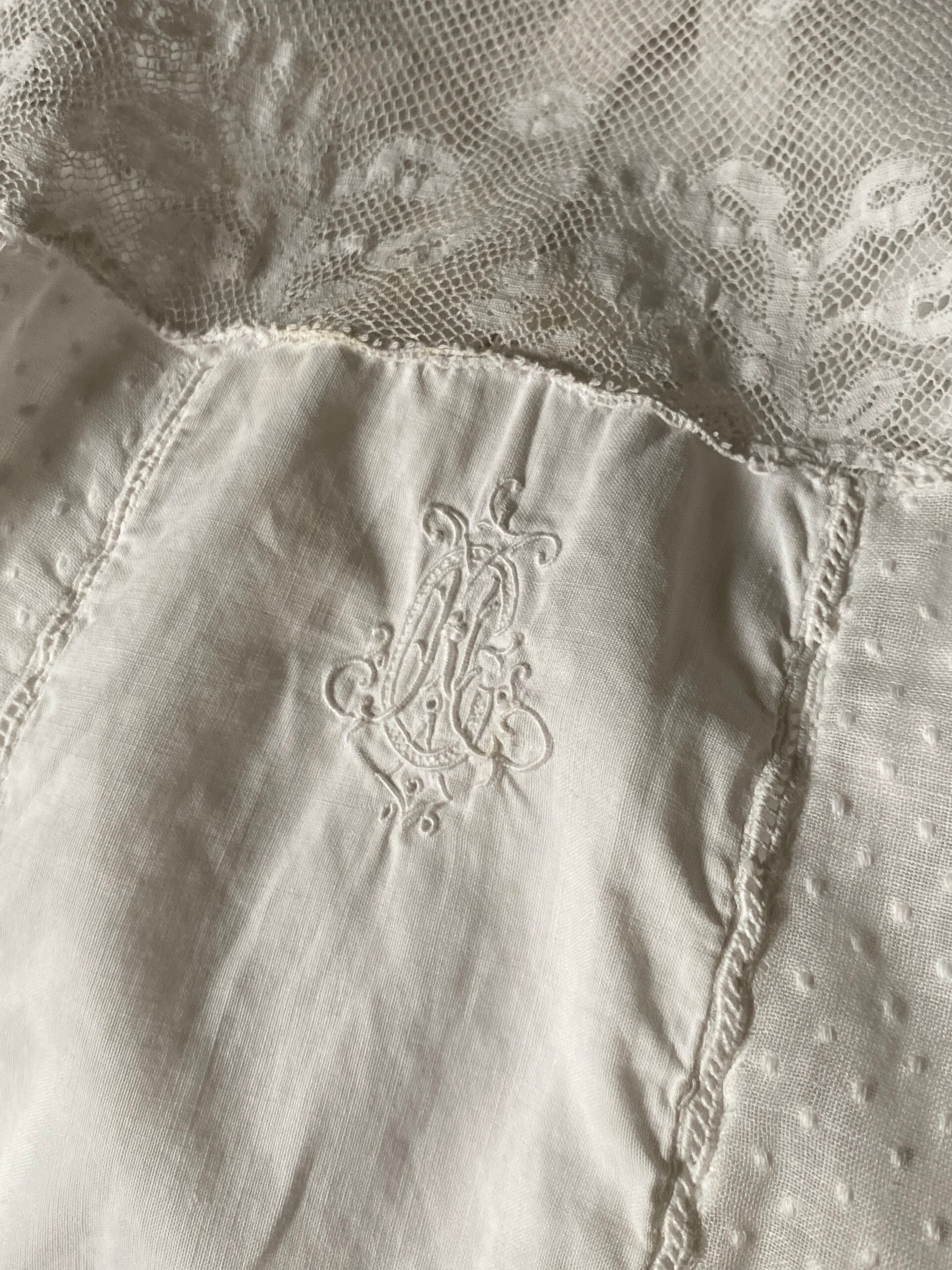 コルセットカバーとペチスカートが一体化したようなデザインのantiqueのペチコートドレス。元来はアンダーウェアとして着用されていたアイテムですが、チュールレースのインサートやピンドットの刺繍、たくさんのボタン、生地がパネリングされたディテールなど、現代においてシティユースに通用するデザイン性の高さです。裾部分は繊細なコットンガーゼ生地と、ボディと同じコットン生地の二重になっているので、ほどよいAラインのシルエットになります。侍女のいるお屋敷の方の物だったのか、本来はボタンが付いている側が背中にくるデザインなのだと思いますが、どちらを前にして着ても可愛いです。また、当時の持ち主のイニシャルが美しいモノグラムの刺繍で施されています。通年さまざまなスタイリングで、長い間大切にご着用いただきたい逸品です。優しくお洗濯済みです。