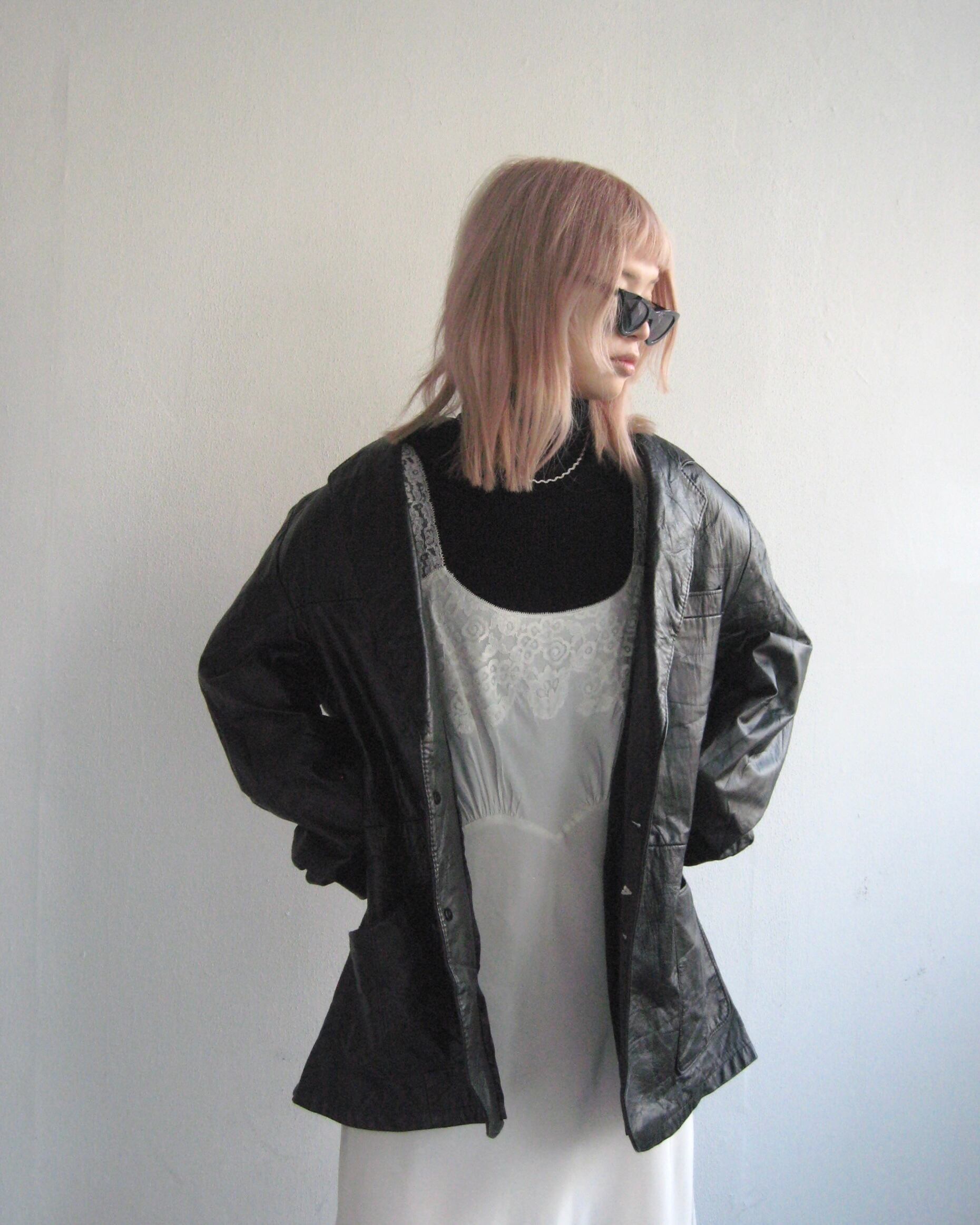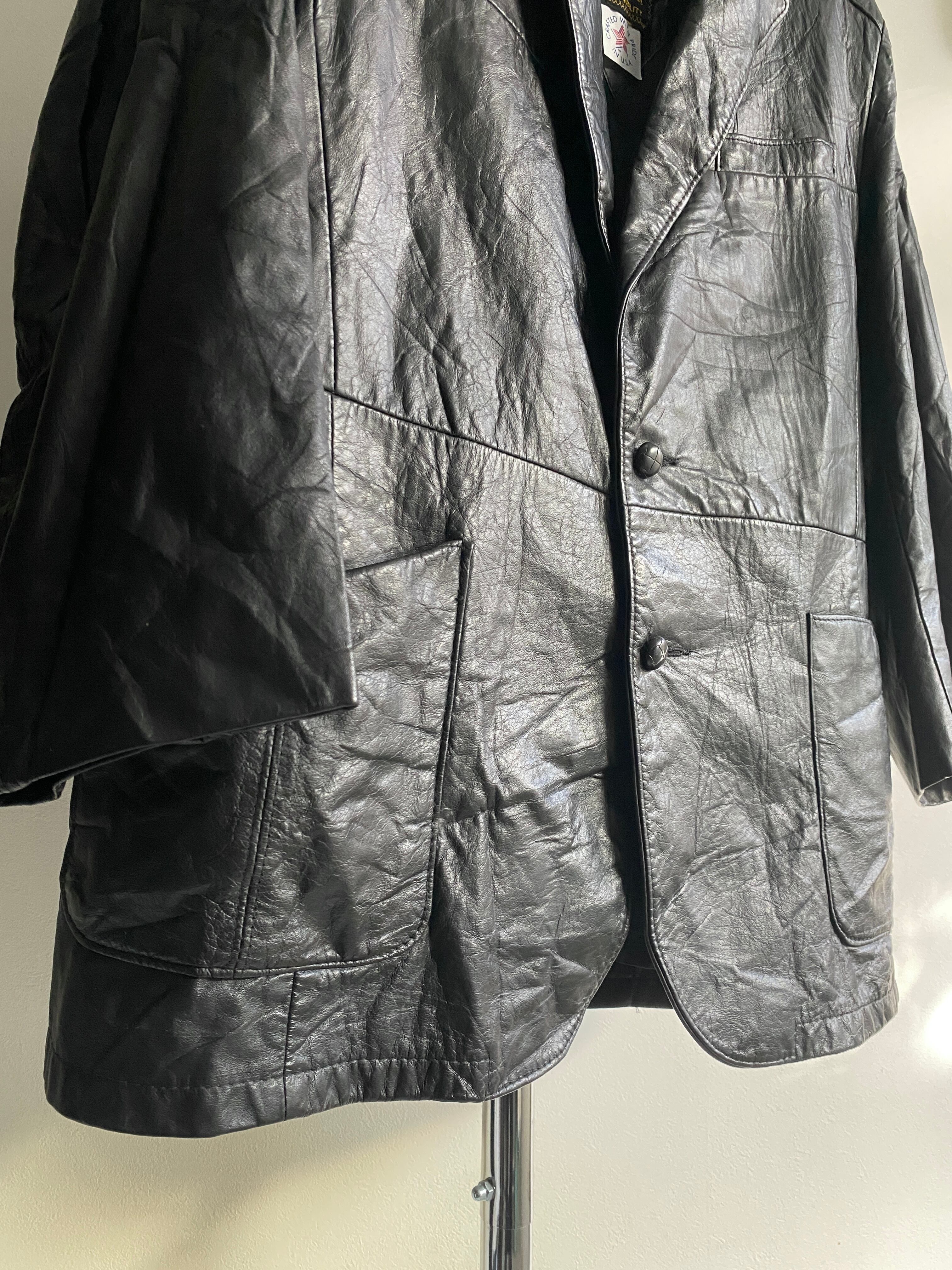 カウハイドのレザーテーラードジャケット。グッドサイズ・グッドコンディションで、今の抜け感のある90sムードに改めて刺さる一着です。antiqueやvintageの生地と合わせてもトゥーマッチにならない、本革ならではの質感が魅力です。ラフにスウェットやパーカーを仕込んでも可愛いです。フロントの2ボタンで開閉。さまざまなスタイリングでお楽しみください。