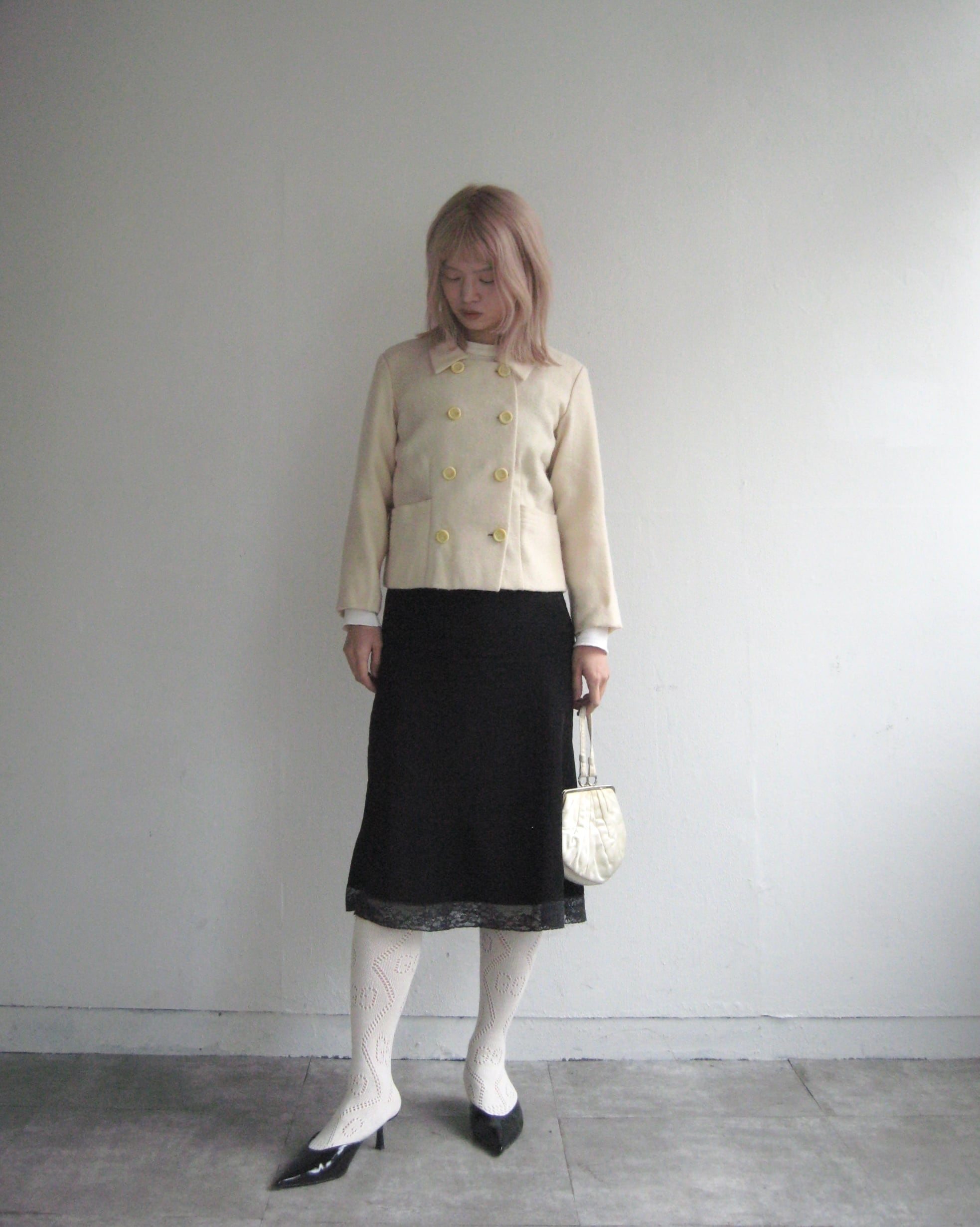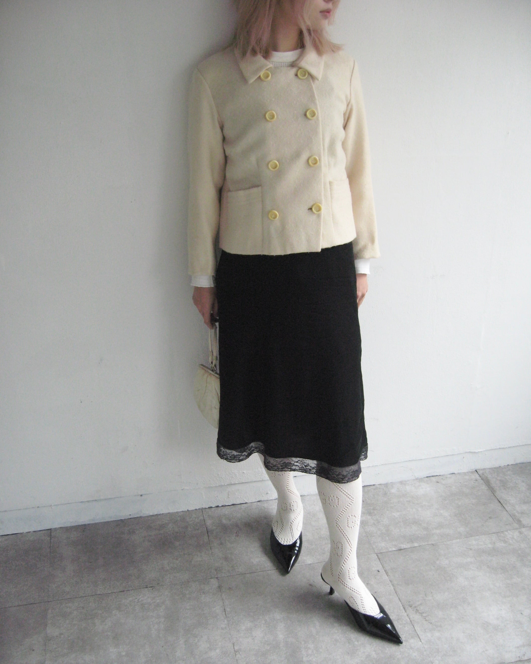 バタークリームカラーのウール生地が可愛いvintageジャケット。軽やかな着心地で、コンパクトなサイジングやトレンドの短丈が、今また着たい一着です。タグが付いておらず、裏地が一部手縫いで丁寧に縫いつけられているディテールから、おそらく当時のホームメイドか、個人のテーラーメイドかと思います。ウールが全体的にピリングしていますが、マルジェラのアーティザナルコレクションのような味のある質感で素敵です。フロントのボタンと、スナップボタンで開閉。優しくお洗濯済みです。